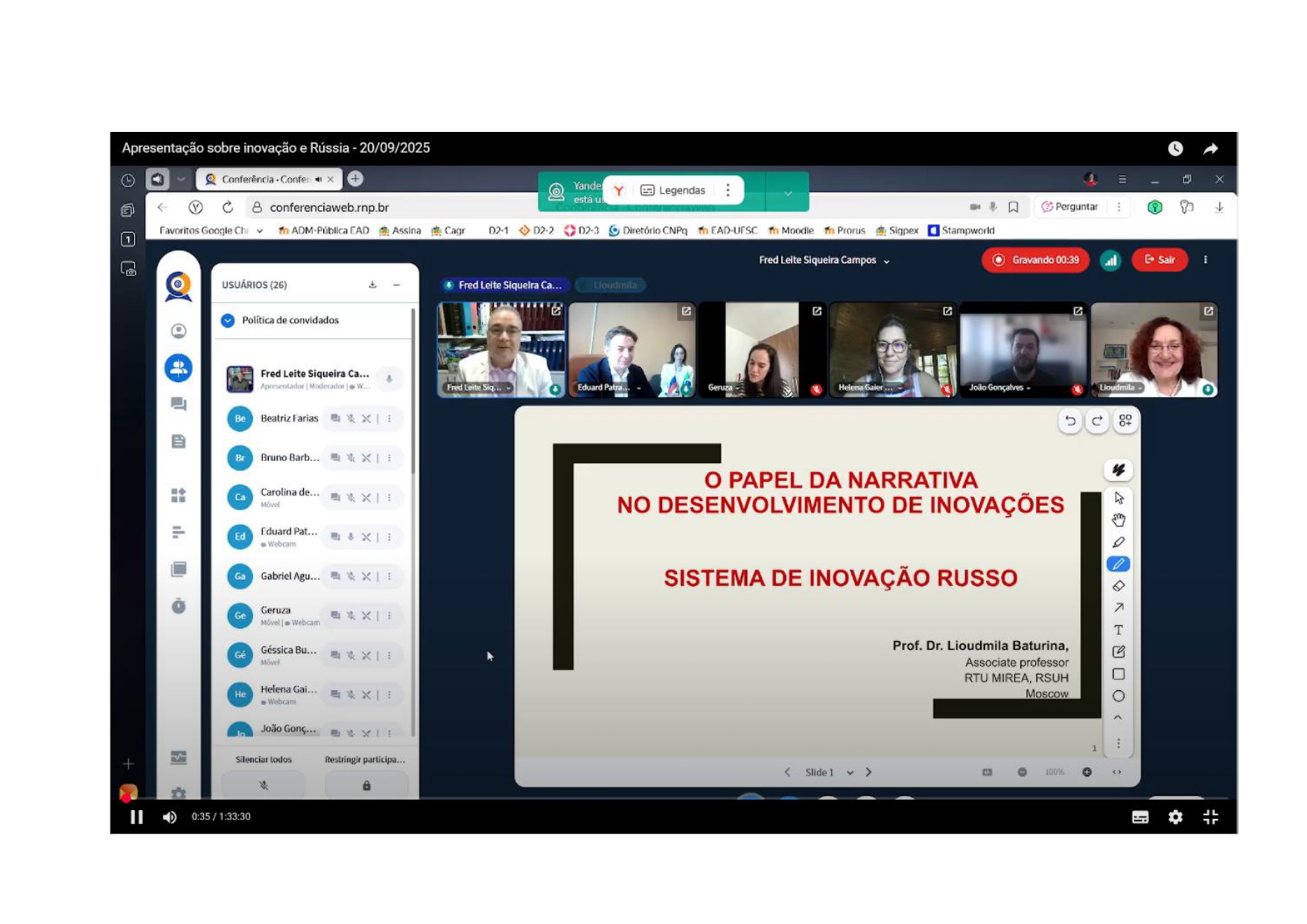 No dia 20 de setembro de 2025, entre 08h e 10h, como parte das atividades da disciplina Políticas Públicas de Ciência, Tecnologia e Inovação e o Estado Brasileiro (POL), o PROFNIT/UFSC recebeu, de forma virtual, três convidados da Federação Russa.