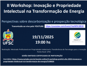 O Mestrado Profissional em Propriedade Intelectual e Transferência de Tecnologia para a Inovação (PROFNIT/UFSC) convida você para o II Workshop: Inovação e Propriedade Intelectual na Transformação de Energia, com o tema:
