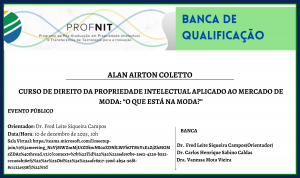 No próximo dia 10 de dezembro, às 10h, teremos a apresentação do trabalho “Curso de Direito da Propriedade Intelectual Aplicado ao Mercado de Moda: O que está na moda?”, sob orientação do Dr. Fred Leite Siqueira Campos.